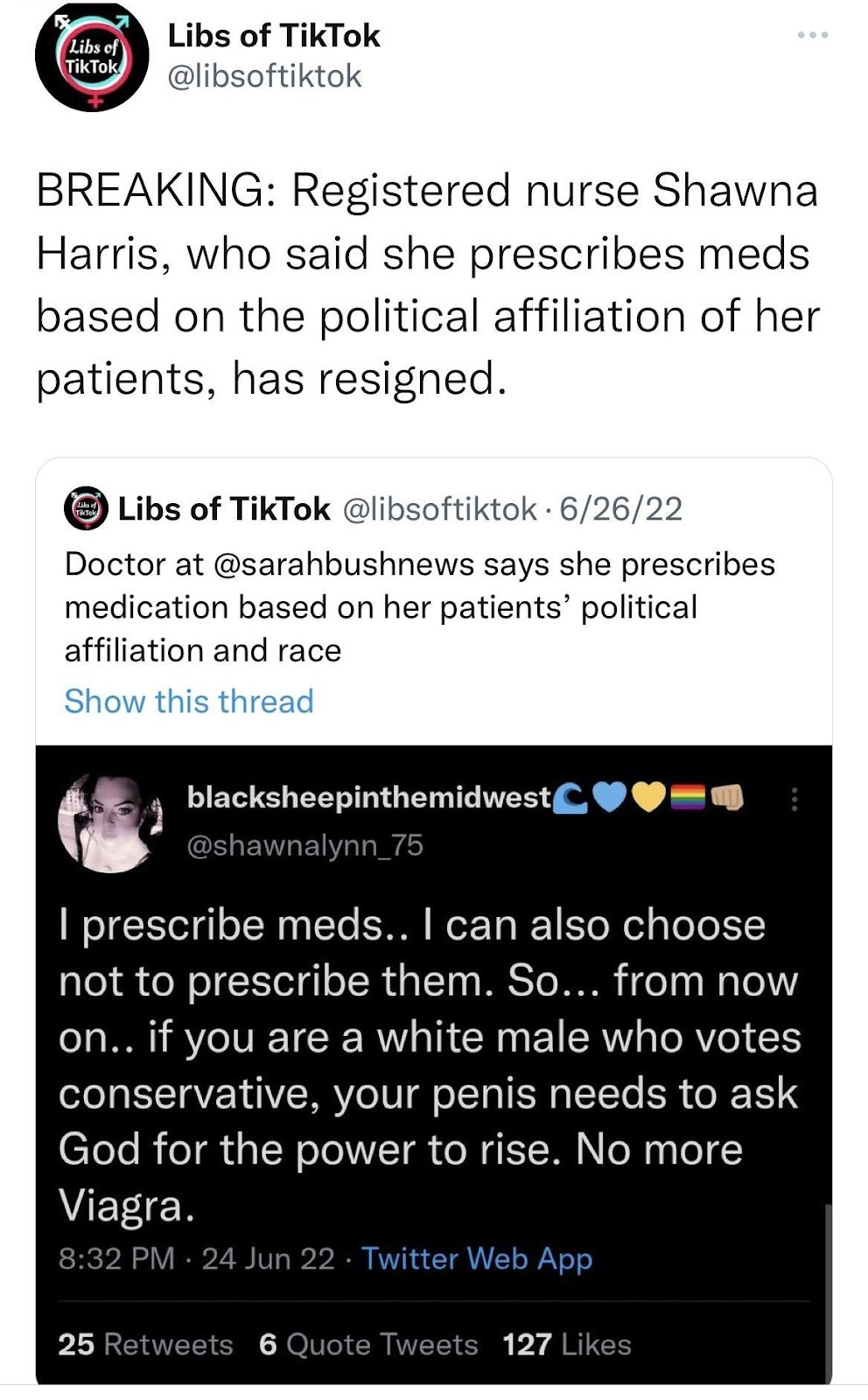 A nurse practitioner resigned for saying she wouldn’t prescribe Viagra to any of her conservative patients. Another resident doctor posted online how she harmed a patient when inserting an IV because he laughed at her pronoun badge. As the saying goes, doctors bury their mistakes. When doctors are indoctrinated to be social justice warriors in college (as they currently are) how many ‘mistakes’ will they have on people with different political leanings? It’s frightening to think of!