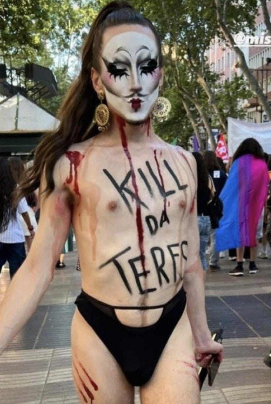 They are the arbitrators of morality. They decide what is hate. Because they have decided they are superior, this is justified. And those who do not agree with them deserve suppression. If you do not agree with radical gender theory you do not deserve kindness. ‘Kill the TERFs’ is celebrated by the ‘be kind’ brigade, like this guy who painted it across his body and walked around in Spain.